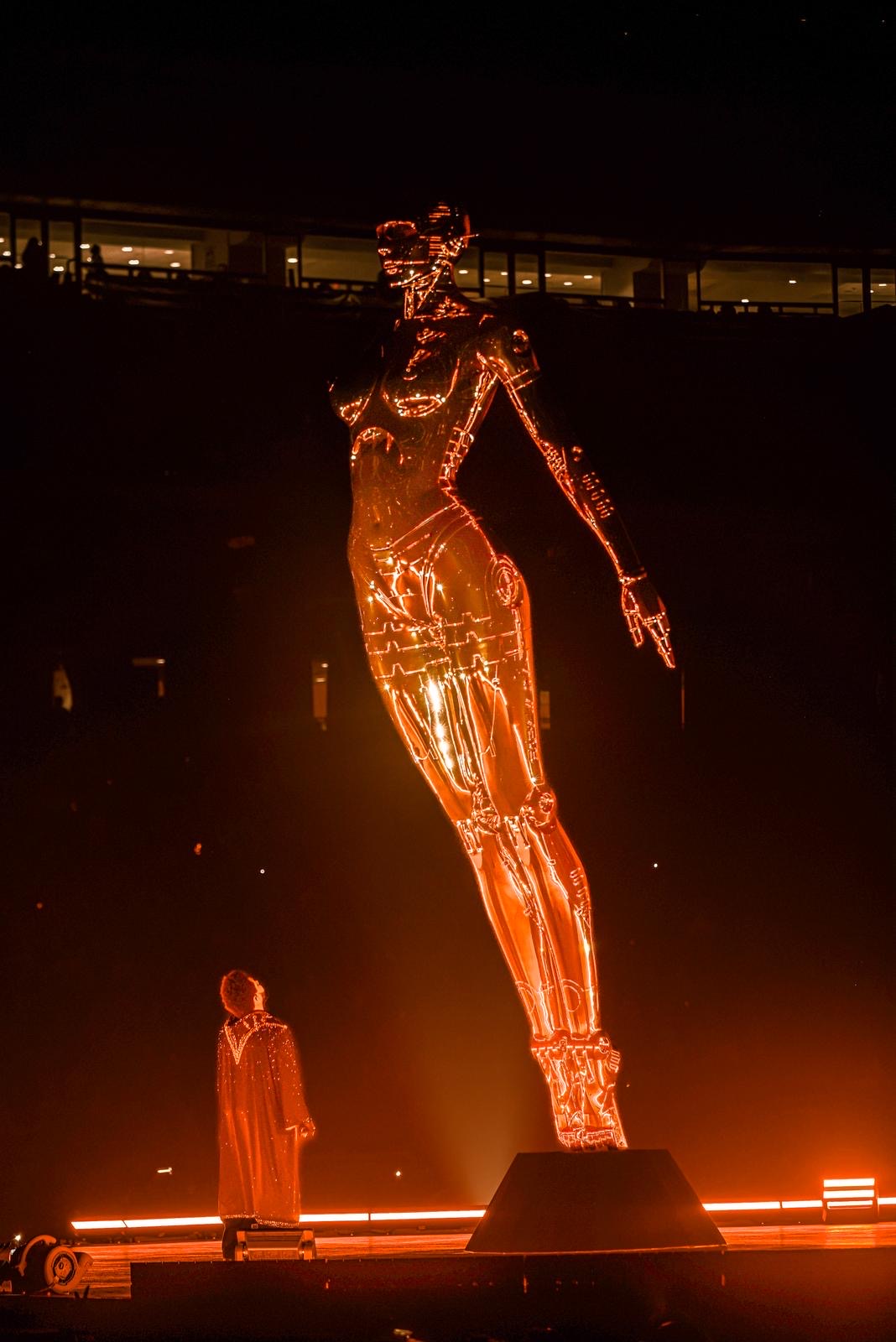 For the 2025 North America Tour, Hajime Sorayama’s iconic “Sexy Robot” returned in a new gold edition, standing as the visual centerpiece of the stage.